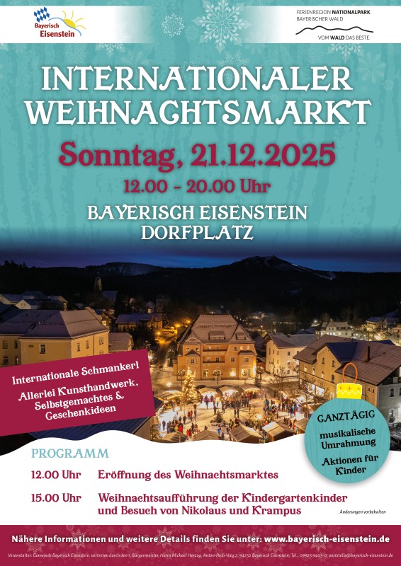 Der Internationale Weihnachtsmarkt in Bayerisch Eisenstein findet traditionell am vierten Advent, dem , sonntags von 12:00 bis 20:00 Uhr am Dorfplatz der Gemeinde Bayerisch Eisenstein statt